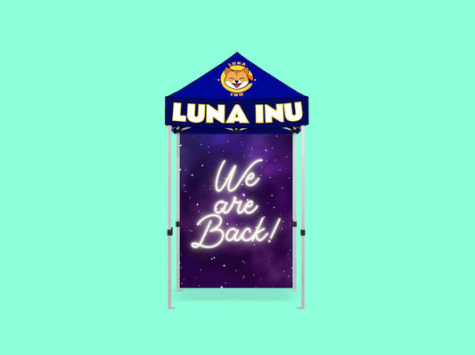 - Trade show custom tents with logo graphics and side banners