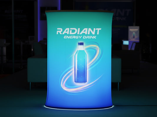 A: A backlit trade show counter uses internal LED lighting to illuminate the printed graphic, turning the front panel into a glowing billboard. This creates higher visibility in crowded venues and helps attract foot traffic. It pairs well with modern booths, product launches, and technology-focused exhibitions.