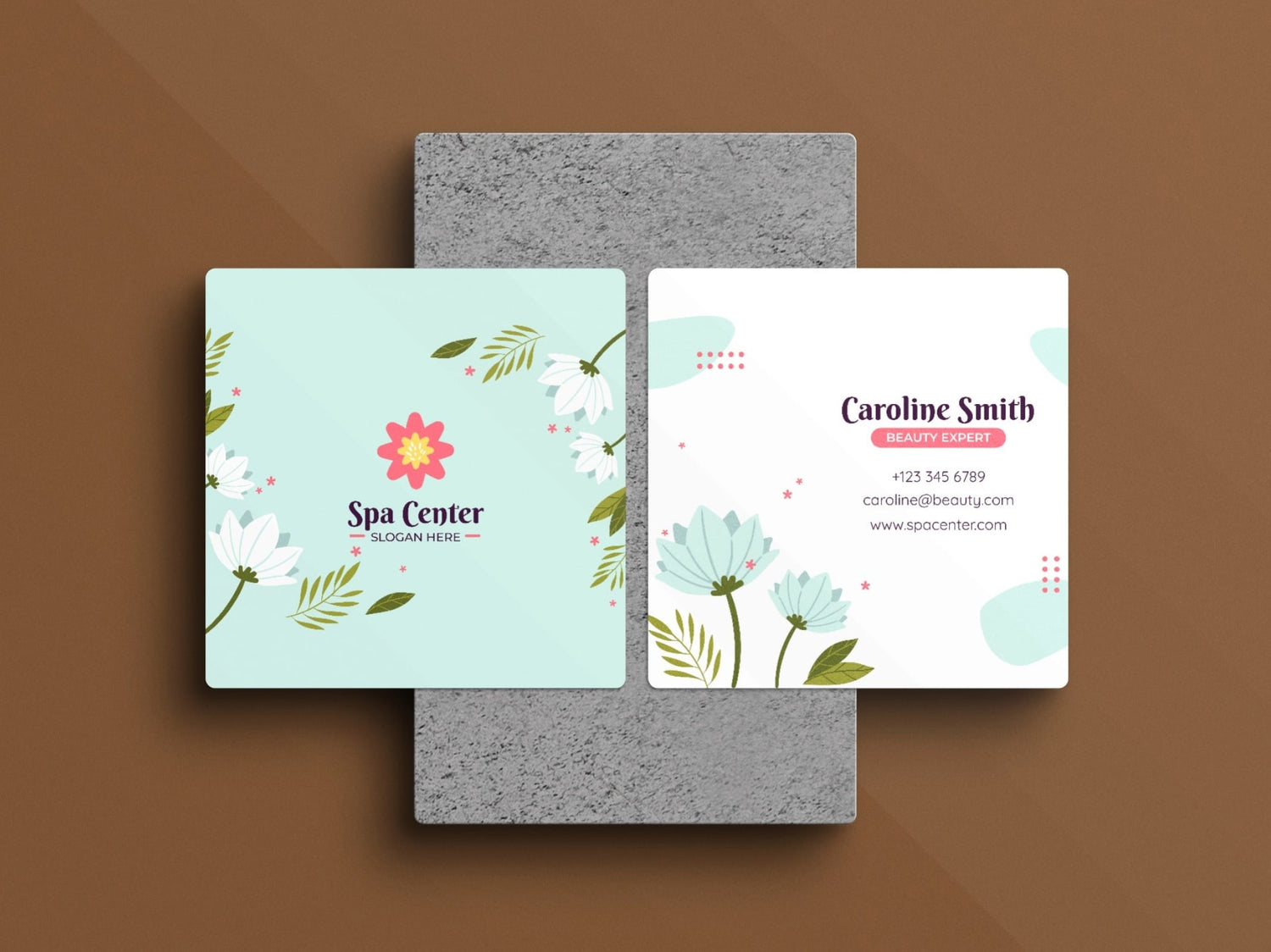 Square business cards with polka dots, floral, or brand patterns