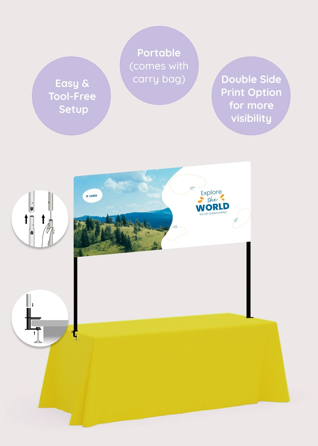 Table top banners are lightweight, foldable, and require no tools for assembly, making them ideal for quick setups. Simply unfold, attach, and you're ready to go in minutes!