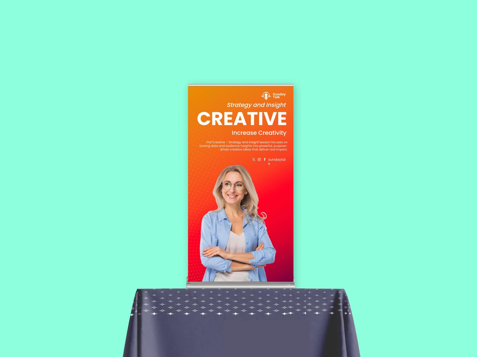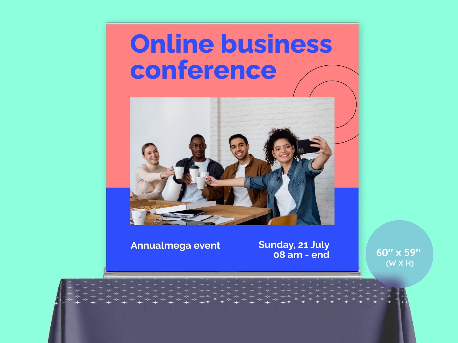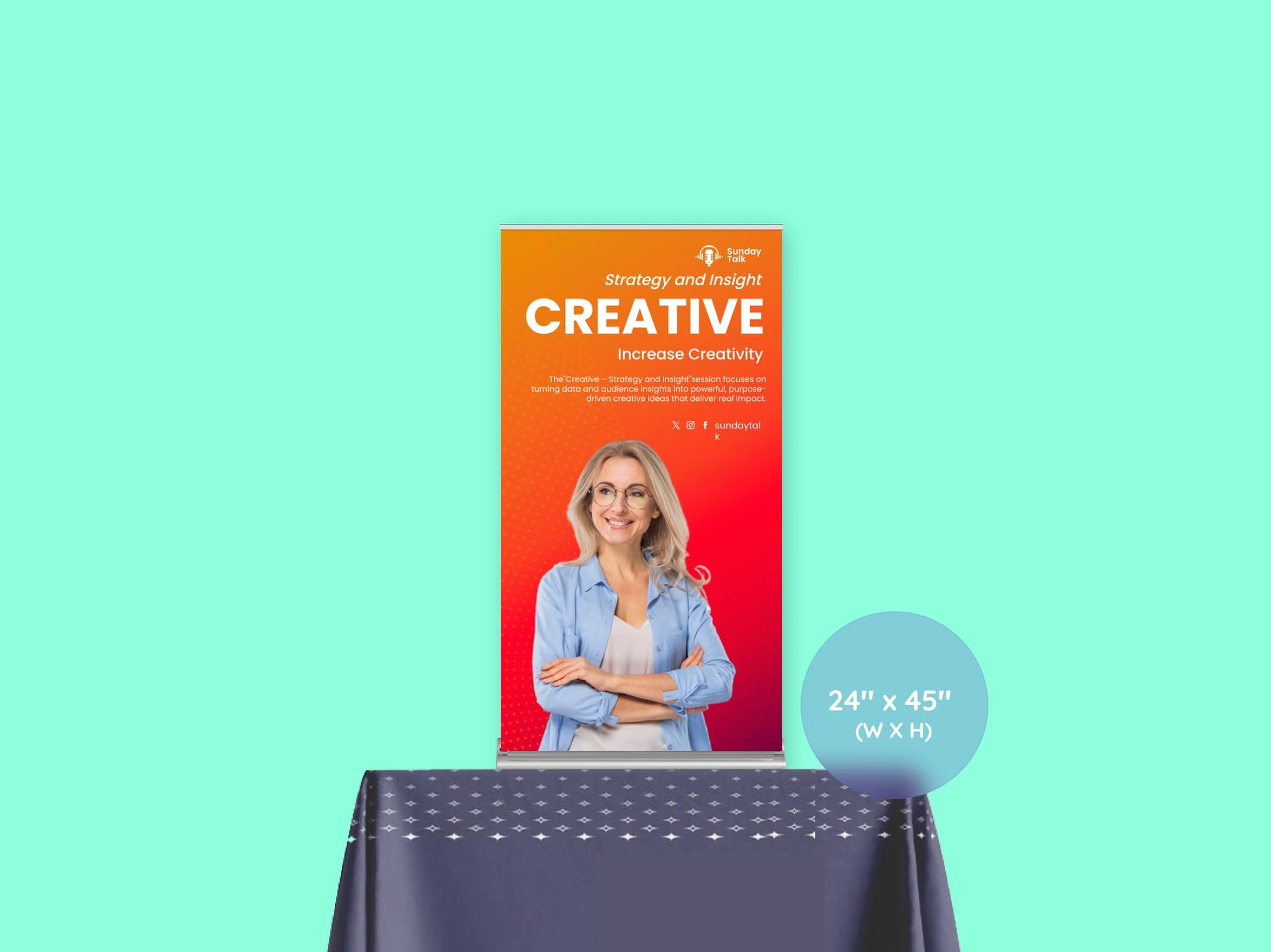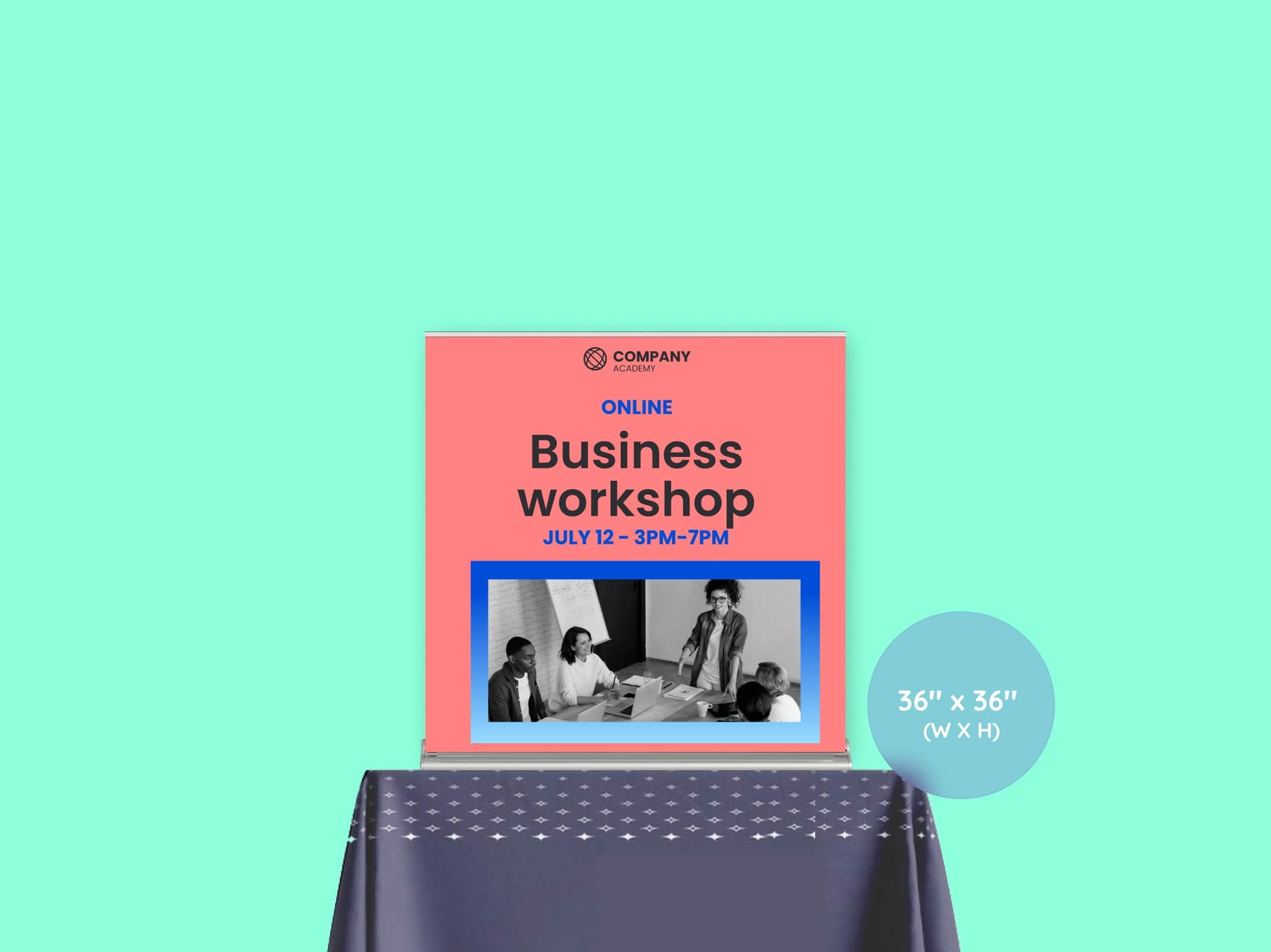 A square format ideal for showcasing logos, slogans, or a mix of imagery and text. Great for retail counters, trade booths, or casual pop-ups where symmetry matters.