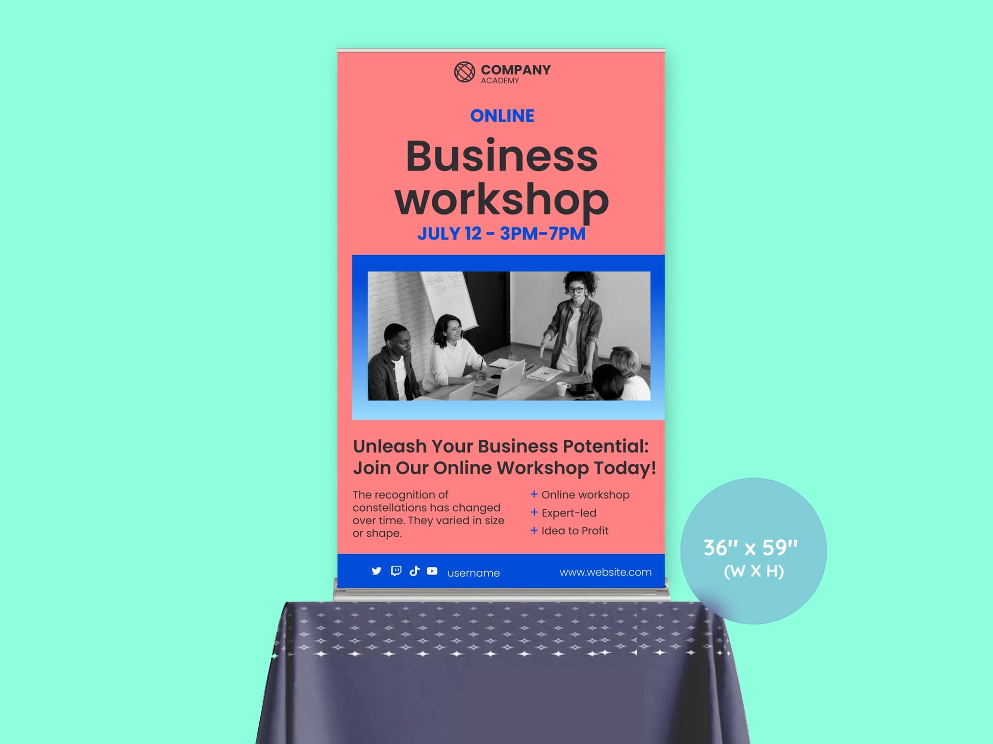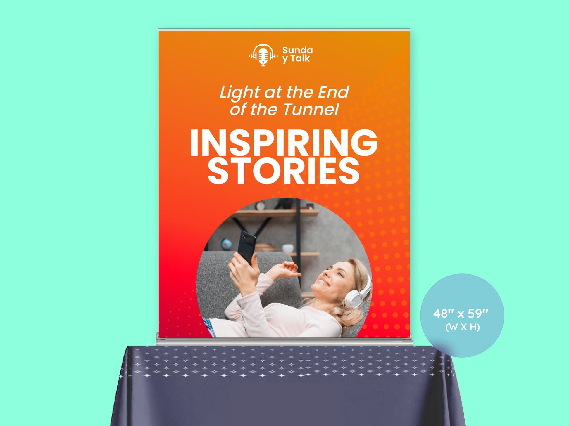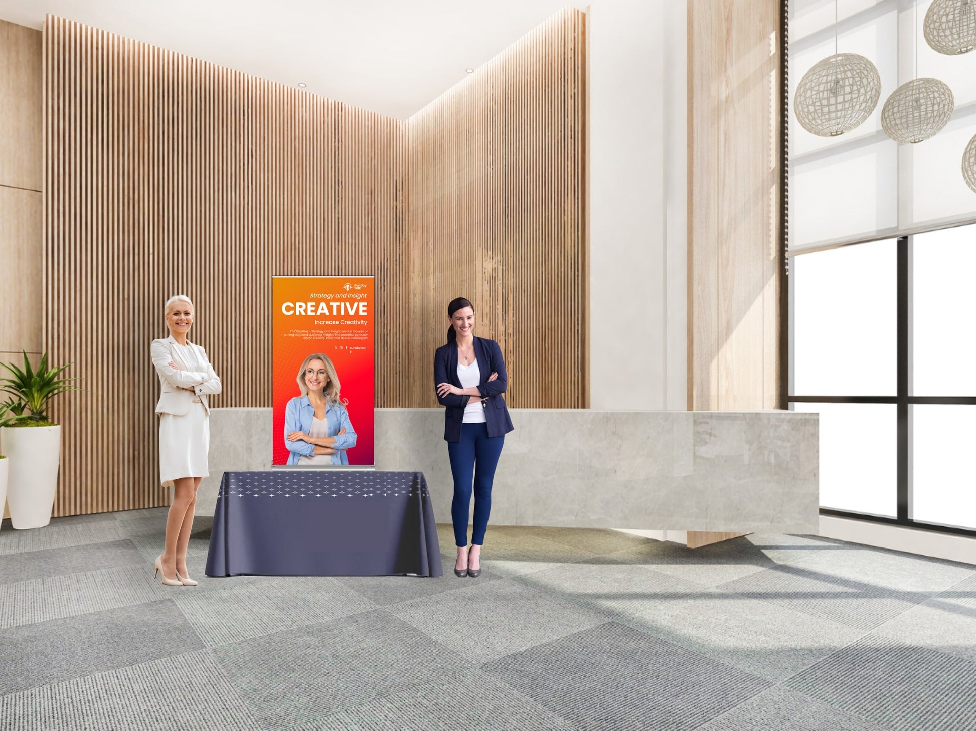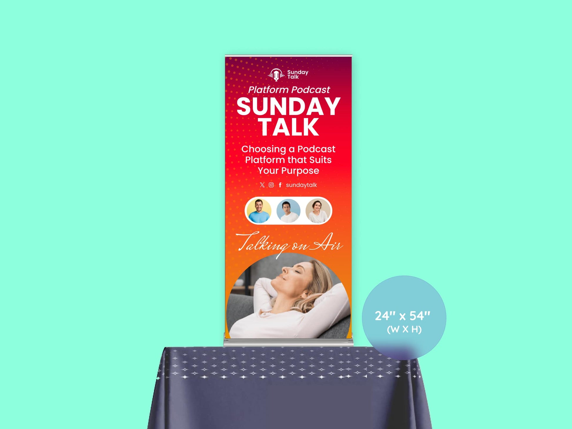 A square format ideal for showcasing logos, slogans, or a mix of imagery and text. Great for retail counters, trade booths, or casual pop-ups where symmetry matters.