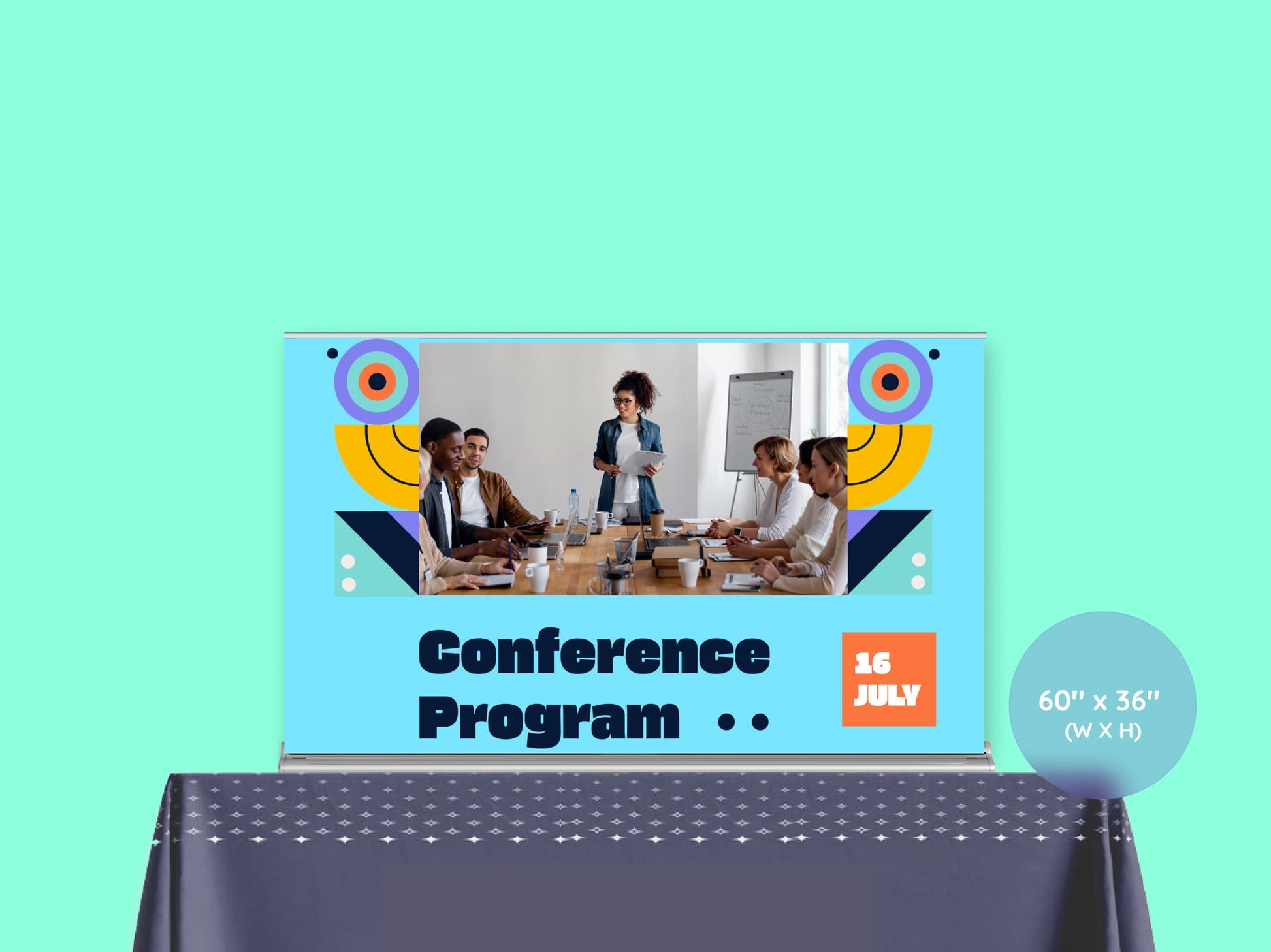 - Custom printed tabletop banners with logos, full-color graphics, or event themes.