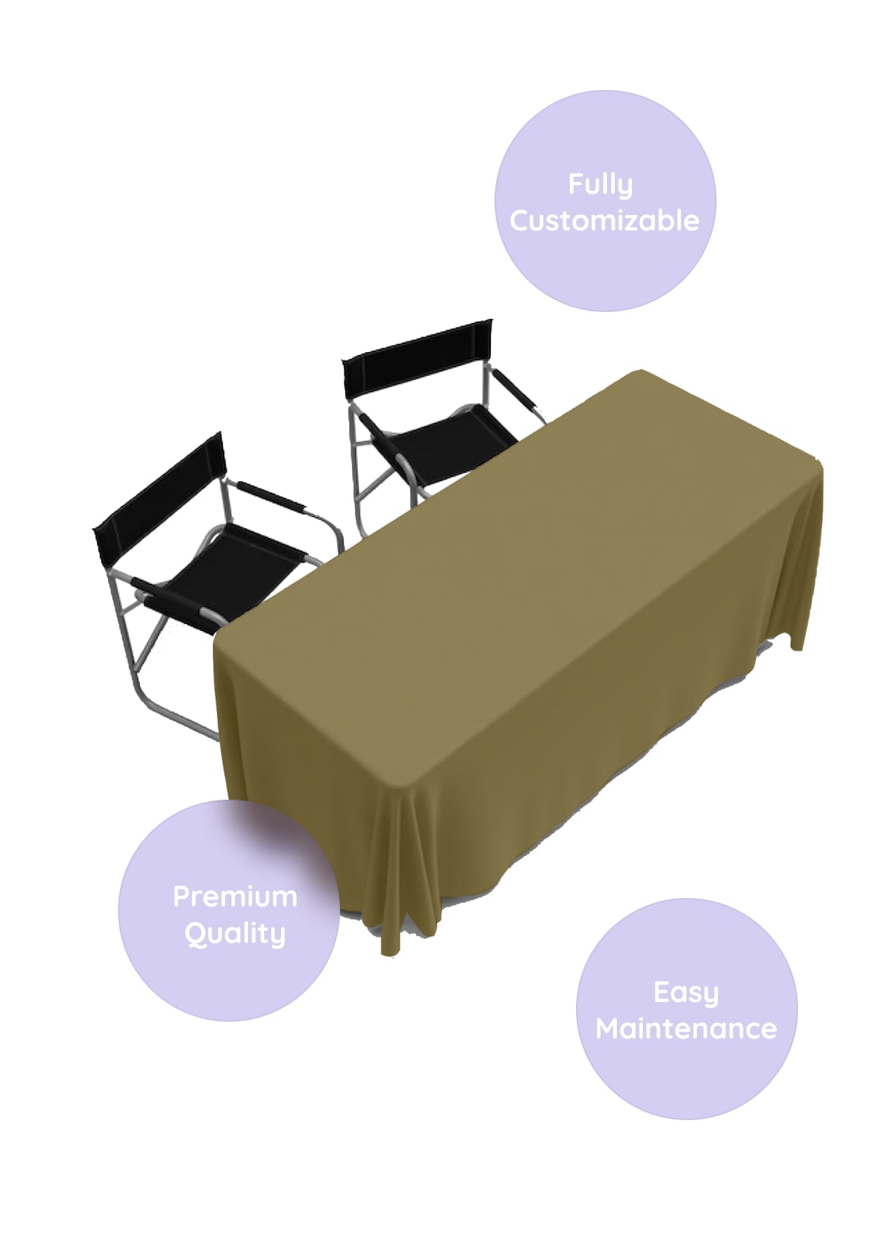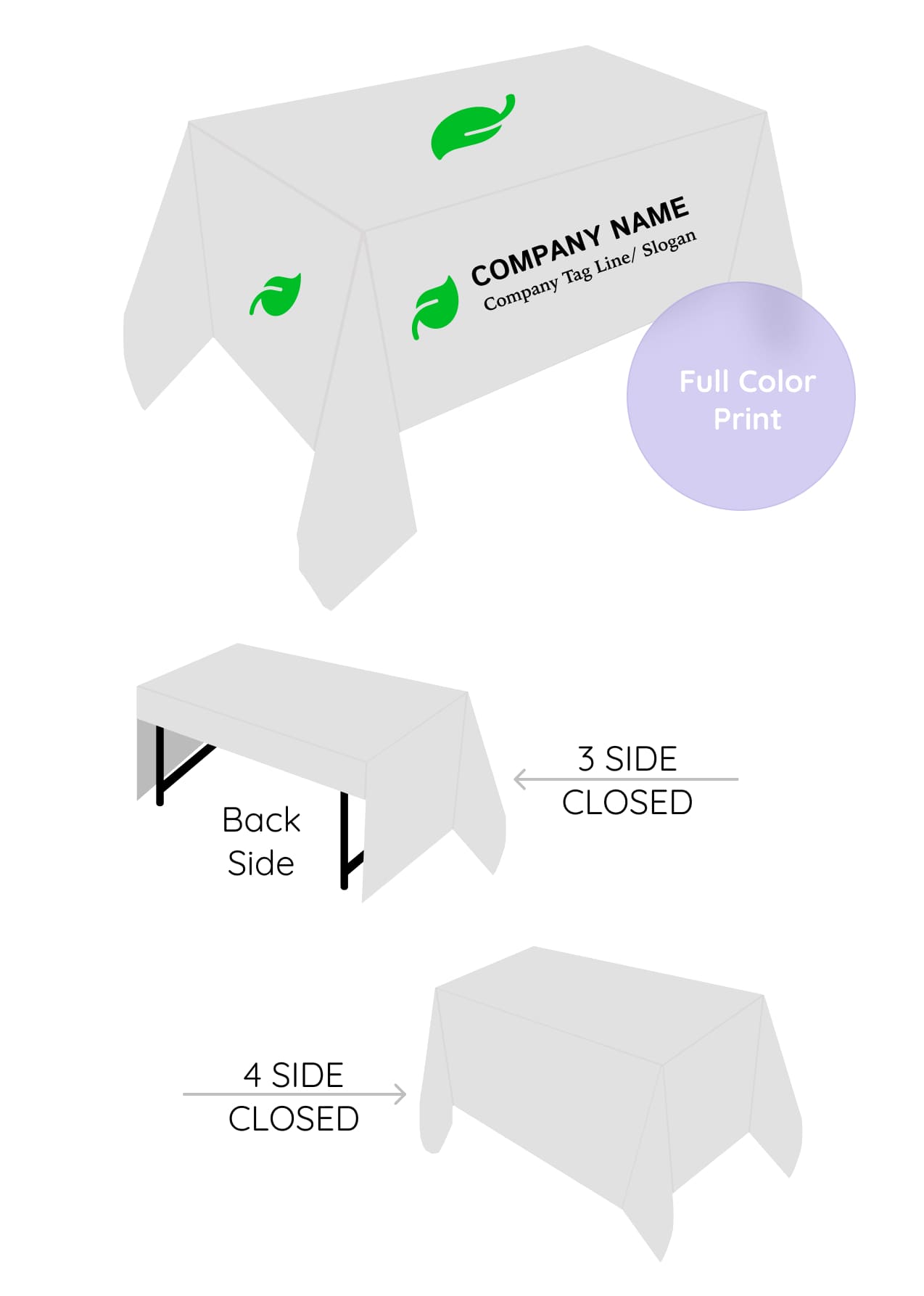 - Formats: trade show fitted table cover, stretchy table cover with logo, or full color 3-sided flat custom table cover.